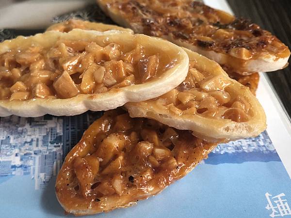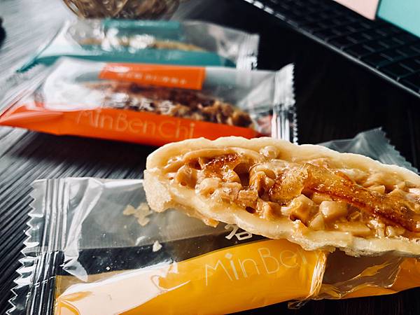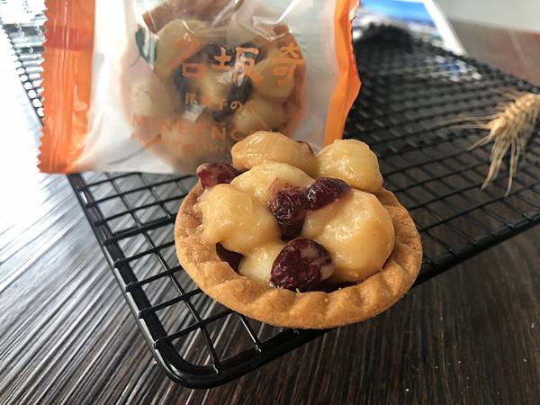 它的塔皮不同於夏威夷豆塔,比較像日本《最中》的餅乾皮,口感吃起來拋拋的,不太會形容,又有點像小baby米餅的口感,