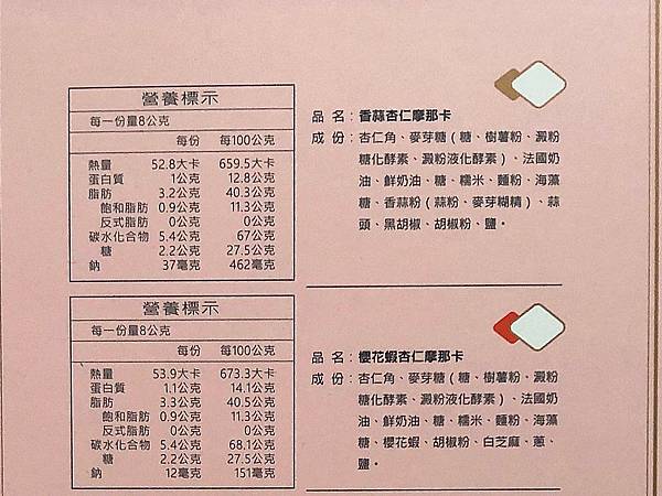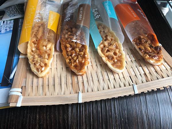 杏仁摩納卡的口味依序是:香橙/香蒜/鹽之花/櫻花蝦