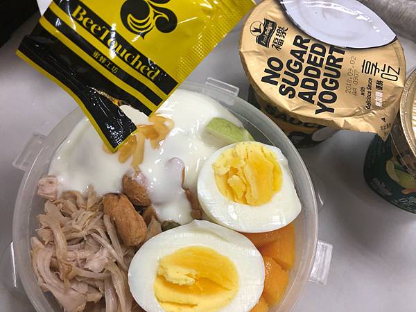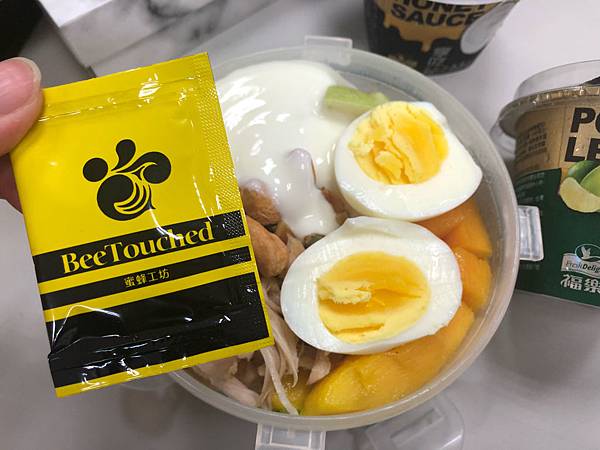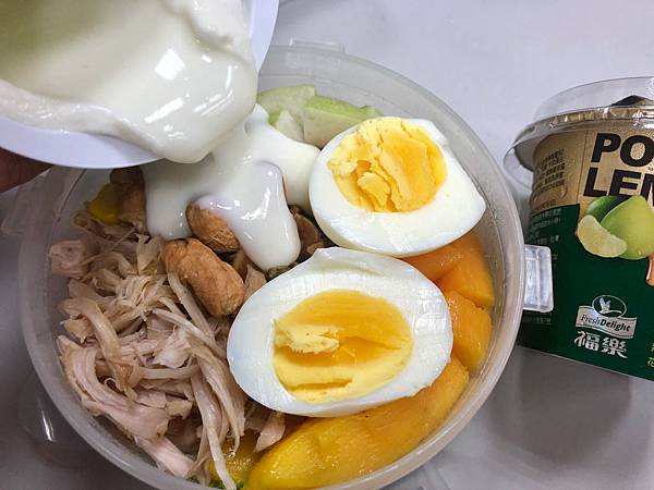首先先倒入一半的優格,在淋上蜂蜜上,雞肉絲搭配優格的滋味滿奇妙的,