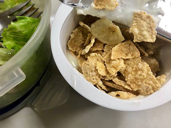 另一個吃法就是加入玉米片食用,這樣吃也可以當早餐,比較有飽足感,玉米片本身就有甜味,