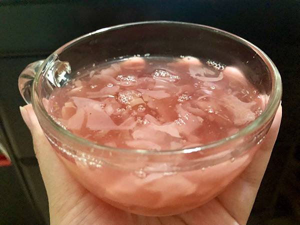 白木耳經長時間的熬煮,木耳已經煮成淡淡的粉紅色,低卡高纖,每天飲用200ml,可以更順暢