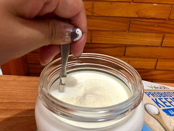 將500ML的鮮奶倒入容器,加入一包益生菌優格粉,將其攪拌均勻,