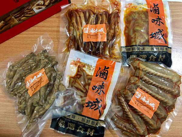 富城滷味城的888滷味禮盒,裡面有鴨翅6支、鴨舌20支、雞腳15支、脆腸200克、酸菜200克