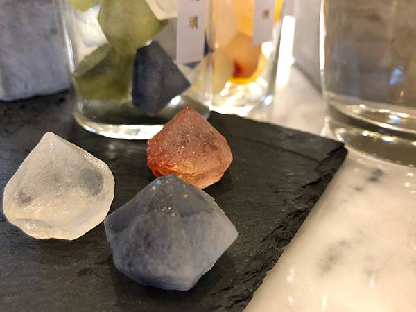 琥珀糖,糖的顏色漸層同時有渲染的感覺,很漂亮,每一個都有不同的感覺,
