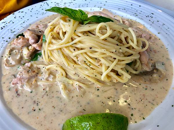 香檸奶油雞肉麵$250 是白醬奶油系列,有檸檬的清香,檸檬搭配雞肉的味道有點妙,不難吃,奶味也是滿重