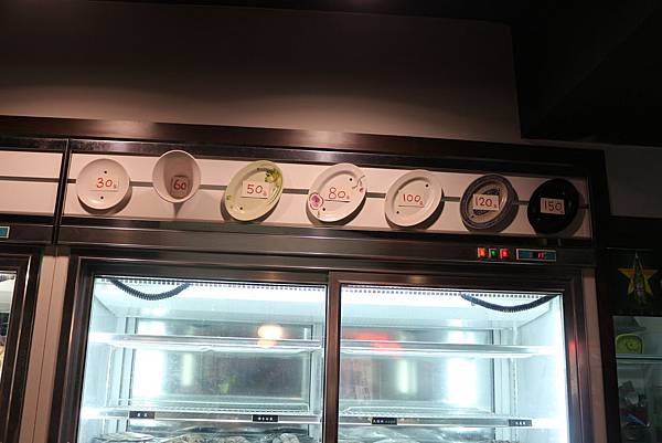 菜盤是自助式,自行到冰箱取餐,盤子的價位從30元~150元,要吃多少拿多少