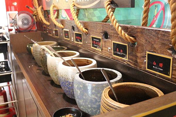每一甕都是不同的調味料,有蒜;蔥;辣椒;香油,依個人喜好自行調配