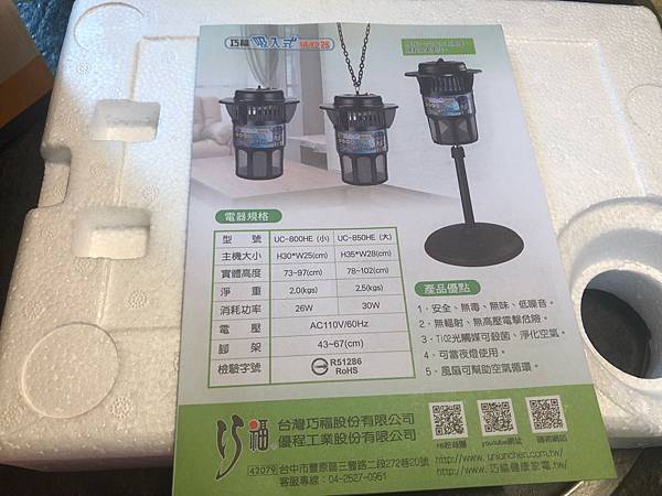 巧福吸入式捕蚊器UC-800HE(小型),現在就來開箱給大家看看,