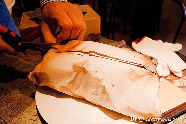 老闆幫忙把包裹的鹽焗好的雞,打開並且教導我們怎麼吃最好吃? 答案是 用手吃