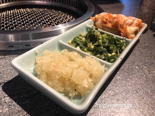 酌料的部分,有洋蔥和青蔥還有泡菜,配著肉吃,解膩的三兄弟,