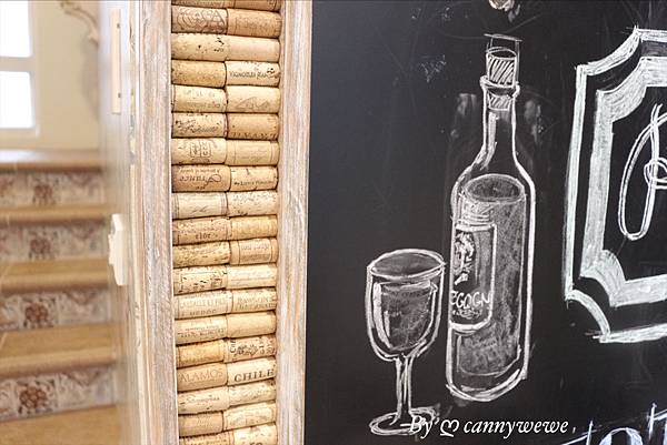 後來發現這面牆很有趣,就是在我們一進門時,看到的那幅畫,畫框是使用紅酒的軟木塞製作,
