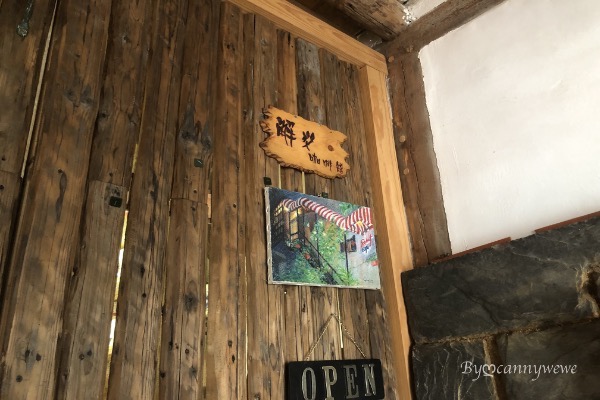 非常簡單的招牌,沒有看到這個板子,我們不知道咖啡館到了,右邊的牌子寫著解放咖啡館的經歷及營業時間,