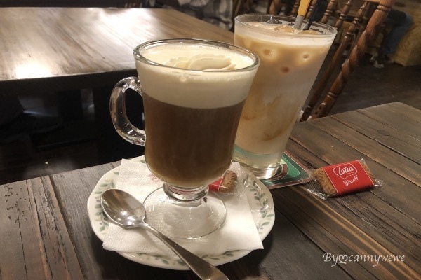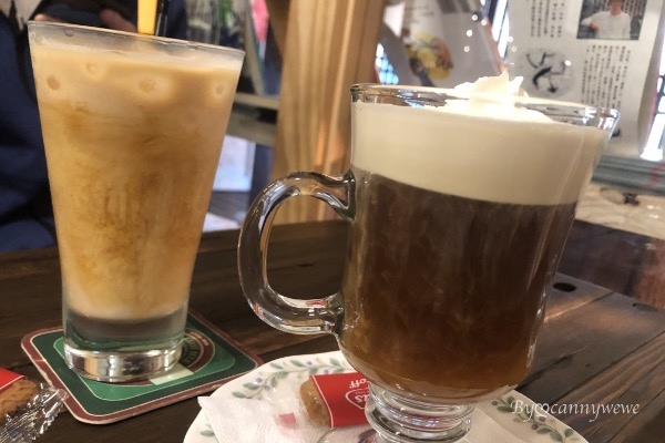 咖啡上桌了,我們點了拿鐵和維也納咖啡(左邊:冰拿鐵/右邊:維也納咖啡熱)