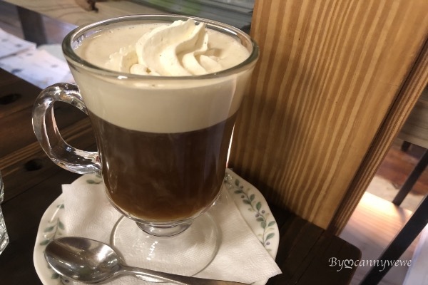上頭的鮮奶油慢慢的融合熱咖啡,熱咖啡微酸的味道,我在想也是屬於偏向輕烘培咖啡豆,