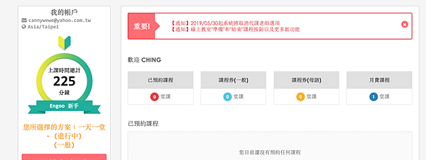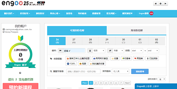 engoo介面做的滿簡單易懂的,而且可以使用手機平板等頁面操作,在頁面中,左邊是累計總上課分鐘數,