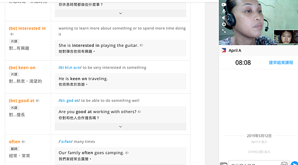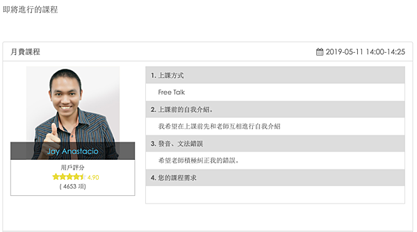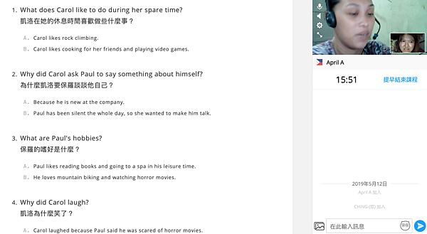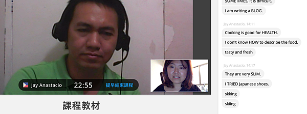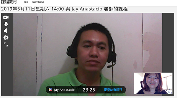 每堂課25分鐘,可以線上預約,是一對一視訊的方式,畫面中就是你跟老師,(線上視訊)
