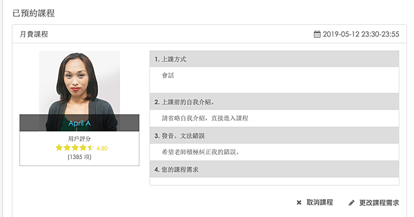 第一點(課程費用相對便宜,相較於外面的補習班價格每次需要付好幾萬的費用,即使有事情也無法取消,這個最慢前15分鐘可以預約)