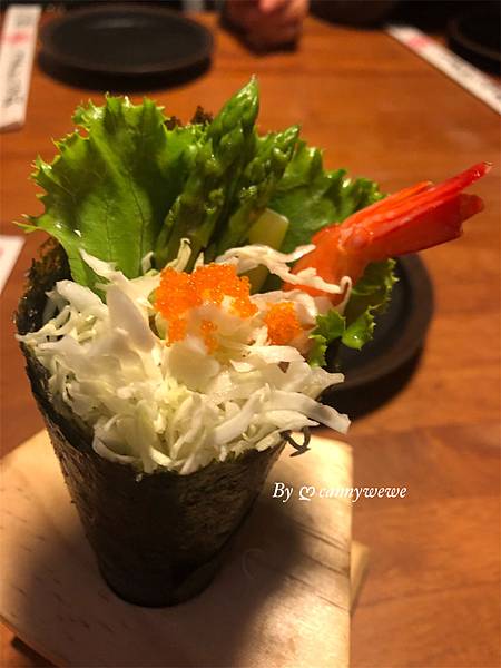 裡面的蝦很隻,手卷沒有飯,裡面就是高麗菜絲,上桌時要盡快食用,
