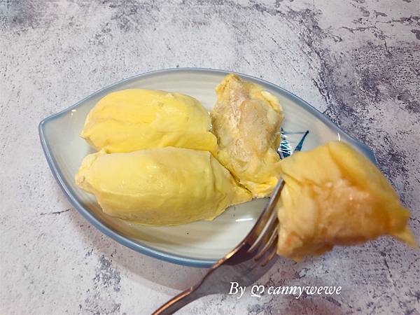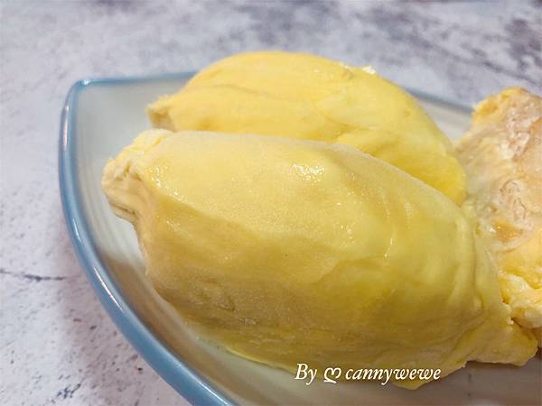 已經把榴槤最美味的程度冷凍,肉質呈現鵝黃色,下面這兩塊是果肉,真的很大瓣,