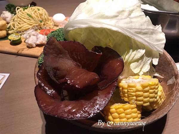 鍋底是用老薑、洋蔥、 大蒜、 西芹、 玉米等有機蔬鍋,豬大骨熬煮而成,