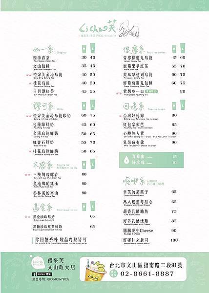 熱門的飲品:禮采芙金湯烏龍 /鮮葡萄遇見包種 /紫想咬一口 /台灣好媳婦 /紅包拿來芭 /心酸無人知 乳果莓有你