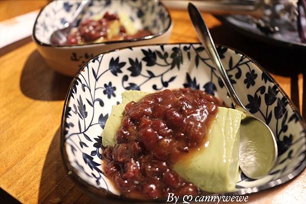 另外,招待我們免費的小甜點,店家之後會推出的新品,蜜紅豆佐抹茶豆腐!!!好特別的一道甜點,