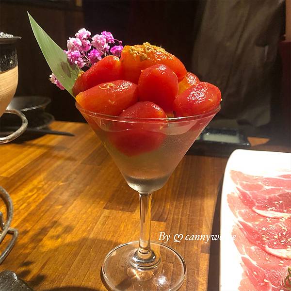 是甜的,吸飽飽桂花蜜的香氣,一口咬下,就像在喝果汁般,番茄會噴汁~~解膩的好幫手