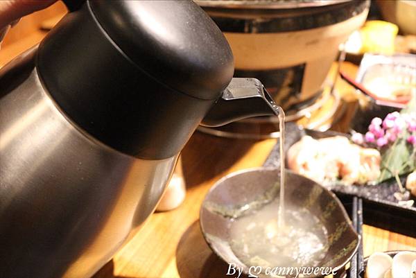 首先,雞湯已經幫您準備好了,一大壺熱騰騰的野菜雞高湯,瞬間讓胃暖呼呼的,雞湯壺有點重,