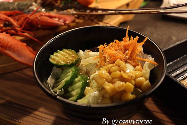 他們的沙拉,裡面有我愛的美生菜,小黃瓜,蘿蔔絲,玉米,葡萄乾,搭配上清爽的和風醬