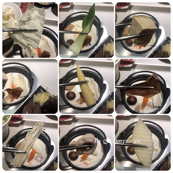 有少量的火鍋料,大多是新鮮時蔬,蘿蔔、地瓜、杏鮑菇、海帶、豆皮、香菇、玉米筍⋯⋯菜盤中的品項多達17樣