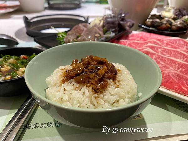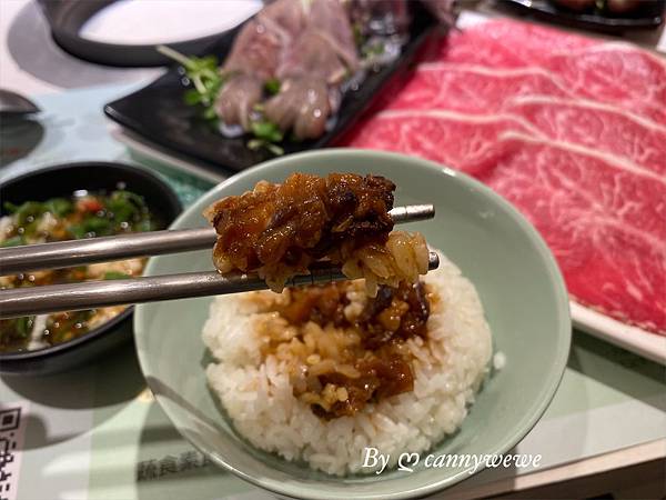滷肉飯上桌後,香味四溢,還沒有等到湯底滾,我已經開始享用滷肉飯,
