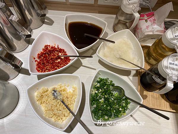 自助式吧台有醬料很齊全,有辣椒、蒜、蔥、蘿蔔泥、沙茶、黑醋、白醋、醬油