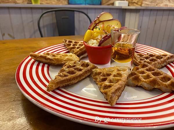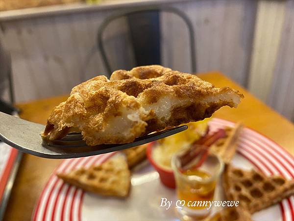 現點現做的鬆餅很可口,熱熱的送上來我就迫不及待的嚐一口,剛上桌的鬆餅,