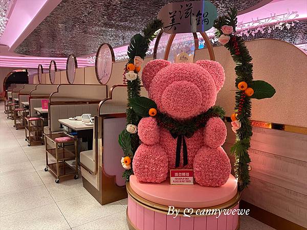 由服務人員帶位後,就會經過這隻大人小孩為之瘋狂的粉紅玫瑰熊,心想等等一定要拍照,根本就是招牌吉祥物