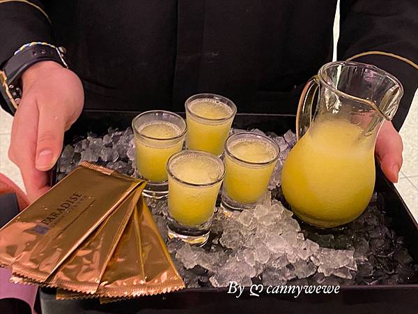 自助吧的甜點和水果也已經吃不下了,飯後,店家端上去油解膩的柚子醋冰沙,及濕紙巾供使用,