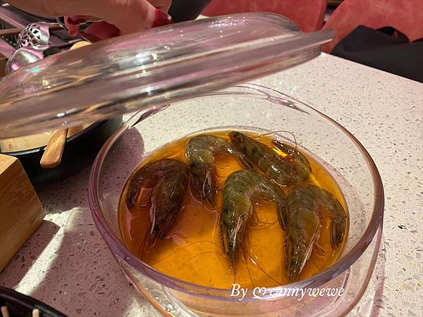 上桌後,蝦子還是活碰亂跳的活蝦,新鮮度是100分,使用花雕酒,讓鮮蝦酒醉,才可以下鍋,