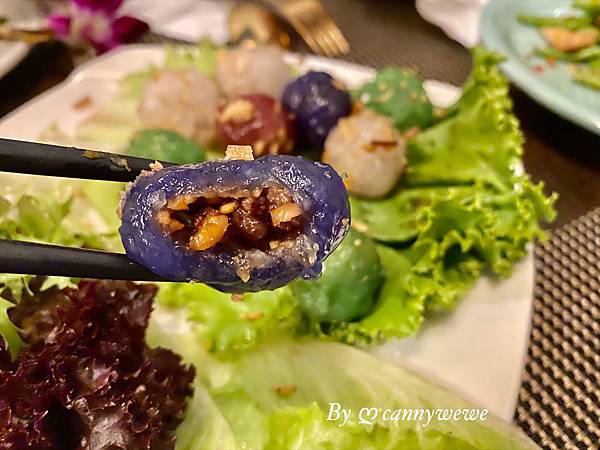 顏色好繽紛,有粉,白,藍,三種顏色,外皮晶瑩剔透,像極了台灣的水晶餃