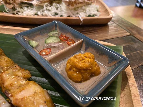 沾取花生醬料會比直接單吃味道更濃郁!沾醋汁比較清爽,沙嗲串本身不沾也不會很死鹹~