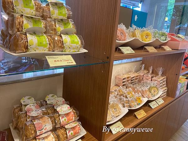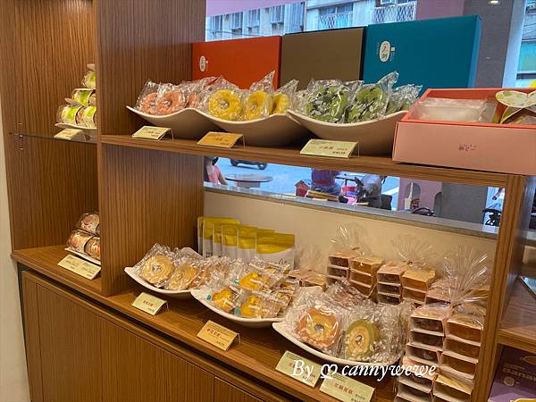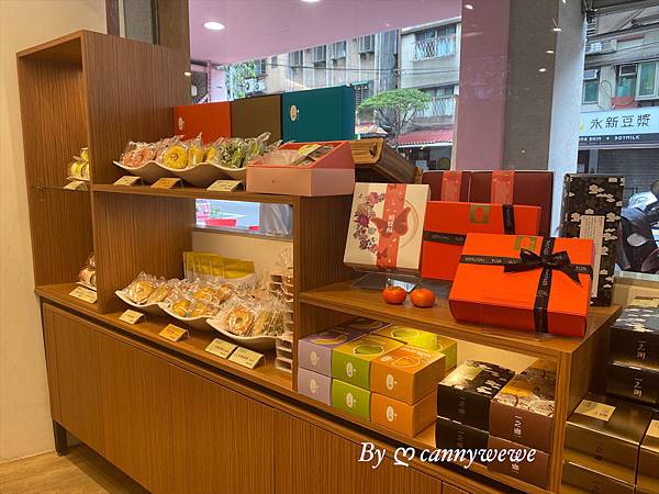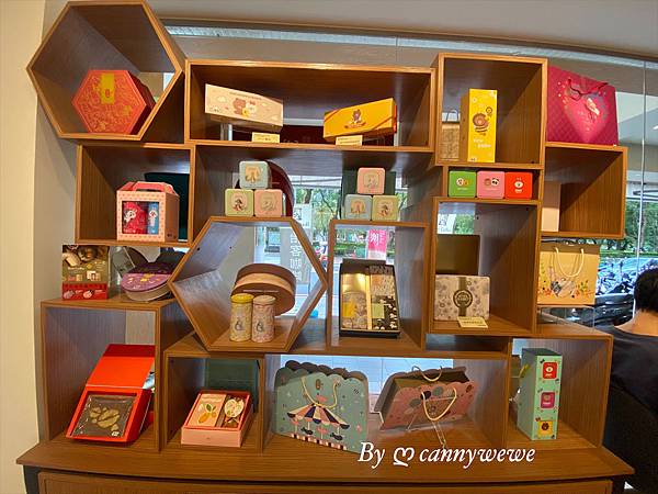 店內伴手禮禮盒展示櫃,有鐵盒,有禮盒,近年來大家都喜歡收到禮盒,
